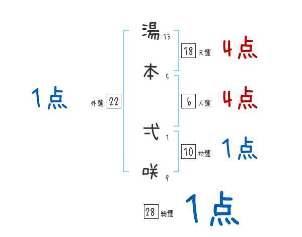 天運![]() | 湯本弌咲さんの天運は18画の4つ星!情熱的で剛気。忍耐力があり信頼される。 家系が持つ宿命的な運勢を表します。祖先から受け継いだ苗字ですので自分の力が及びません。家柄を象徴します。 |