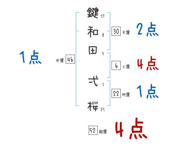 天運![]() | 鍵和田弌桜さんの天運は30画の2つ星!浮き沈みの激しさに注意しましょう。 家系が持つ宿命的な運勢を表します。祖先から受け継いだ苗字ですので自分の力が及びません。家柄を象徴します。 |