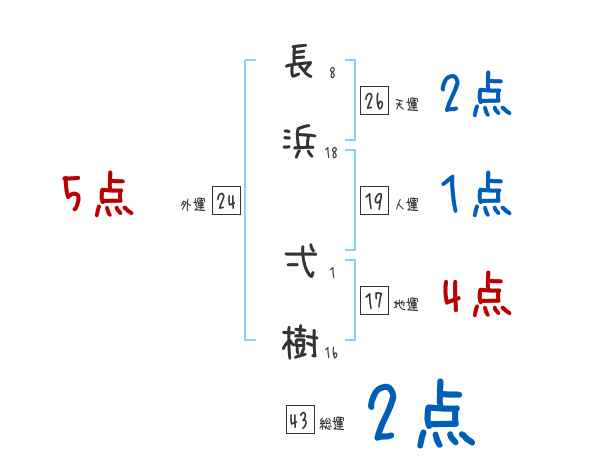 天運![]() | 長浜弌樹さんの天運は26画の2つ星!波瀾万丈かも。信頼できる人を大事にしましょう。 家系が持つ宿命的な運勢を表します。祖先から受け継いだ苗字ですので自分の力が及びません。家柄を象徴します。 |