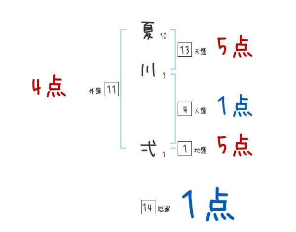 人運![]() | 夏川弌さんの人運は4画の1つ星!感情が不安定で苦労するかも。周囲との協調を心掛けましょう。 性格や才能などを表す2番目に重要な運勢です。人間関係や協調性、社会的な成功に影響します。主に20歳から50歳ぐらいまでの中年期の運勢を表します。 |