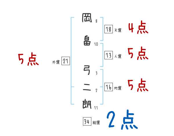 総運![]() | 岡畠弓二朗さんの総運は34画の2つ星!独創性に優れるが、自尊心が強く災難に注意しましょう。 あなたの人生を表す1番重要な運勢です。生涯を通じて影響する総合運となり、主に50歳以降の晩年期に影響を及ぼします。 |