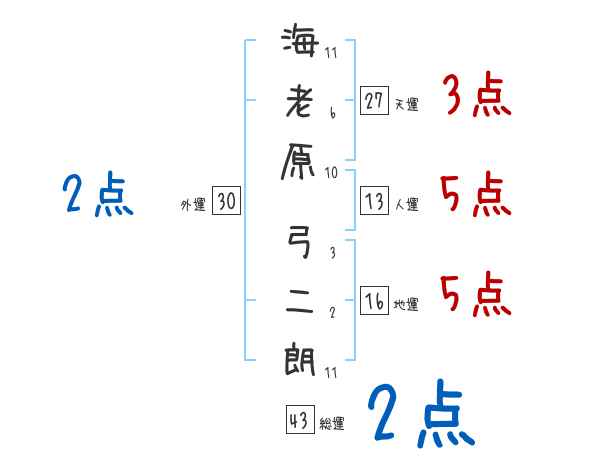 総運![]() | 海老原弓二朗さんの総運は43画の2つ星!頑固な性格で独立心が強いかも。やや非現実的で浪費に注意しましょう。 あなたの人生を表す1番重要な運勢です。生涯を通じて影響する総合運となり、主に50歳以降の晩年期に影響を及ぼします。 |