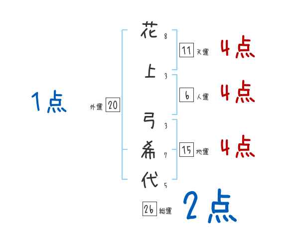総運![]() | 花上弓希代さんの総運は26画の2つ星!波瀾万丈かも。信頼できる人を大事にしましょう。 あなたの人生を表す1番重要な運勢です。生涯を通じて影響する総合運となり、主に50歳以降の晩年期に影響を及ぼします。 |