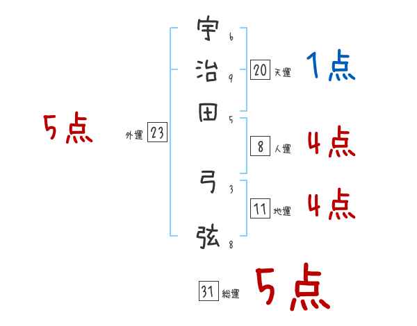 総運![]() | 宇治田弓弦さんの総運は31画の5つ星!社交性があり判断力に優れる。順風満帆な人生で円満な生活。 あなたの人生を表す1番重要な運勢です。生涯を通じて影響する総合運となり、主に50歳以降の晩年期に影響を及ぼします。 |