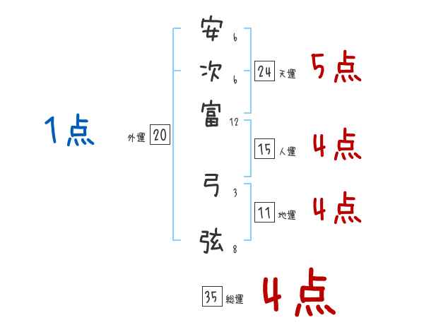 天運![]() | 安次富弓弦さんの天運は24画の5つ星!家庭運が良く順調な人生。金運にも恵まれる。 家系が持つ宿命的な運勢を表します。祖先から受け継いだ苗字ですので自分の力が及びません。家柄を象徴します。 |