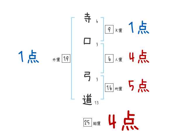 天運![]() | 寺口弓道さんの天運は9画の1つ星!消極的で才能を発揮することが苦手なことも。周りの意見に耳を傾けましょう。 家系が持つ宿命的な運勢を表します。祖先から受け継いだ苗字ですので自分の力が及びません。家柄を象徴します。 |
