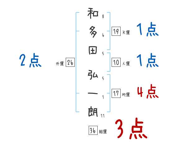 外運![]() | 和多田弘一朗さんの外運は26画の2つ星!波瀾万丈かも。信頼できる人を大事にしましょう。 生活面を象徴する運勢です。外部から受ける影響力を表し、結婚運、家庭運や職場、環境への順応性を表します。 |