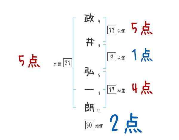 外運![]() | 政井弘一朗さんの外運は21画の5つ星!統率力がある。独立し成功する。名誉を手に入れる。 生活面を象徴する運勢です。外部から受ける影響力を表し、結婚運、家庭運や職場、環境への順応性を表します。 |