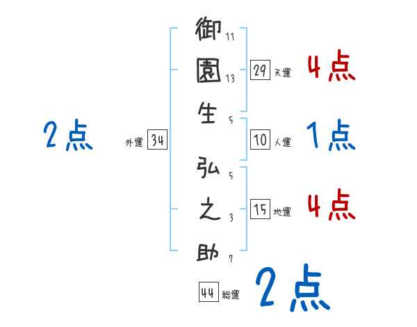 地運![]() | 御園生弘之助さんの地運は15画の4つ星!人徳があり出世する。順調に物事を進め円満な人生。 個性を表す基礎的な運勢です。性格形成や対人関係、行動力など家庭環境に影響されます。主に誕生してから20歳くらいまでの若年期の運勢を表します。 |