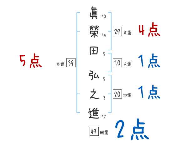 外運![]() | 眞榮田弘之進さんの外運は39画の5つ星!社交性に優れ人望が厚い。人の上に立ち成功する。 生活面を象徴する運勢です。外部から受ける影響力を表し、結婚運、家庭運や職場、環境への順応性を表します。 |