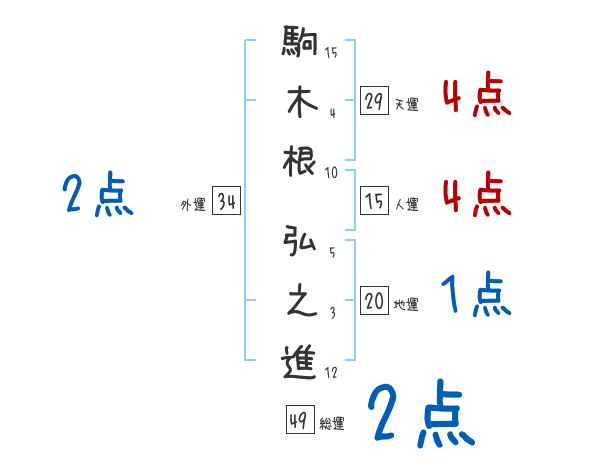 人運![]() | 駒木根弘之進さんの人運は15画の4つ星!人徳があり出世する。順調に物事を進め円満な人生。 性格や才能などを表す2番目に重要な運勢です。人間関係や協調性、社会的な成功に影響します。主に20歳から50歳ぐらいまでの中年期の運勢を表します。 |