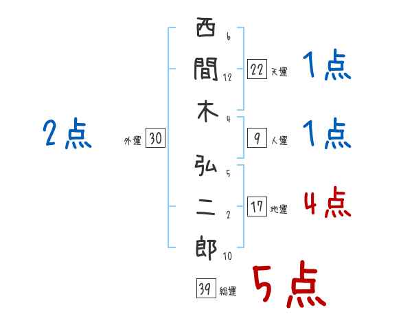 総運![]() | 西間木弘二郎さんの総運は39画の5つ星!社交性に優れ人望が厚い。人の上に立ち成功する。 あなたの人生を表す1番重要な運勢です。生涯を通じて影響する総合運となり、主に50歳以降の晩年期に影響を及ぼします。 |
