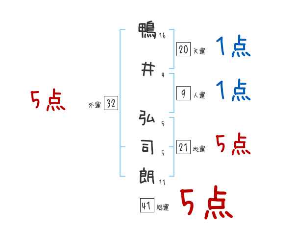 外運![]() | 鴨井弘司朗さんの外運は32画の5つ星!柔軟性があり成功する。チャンスが多く金運が良い。 生活面を象徴する運勢です。外部から受ける影響力を表し、結婚運、家庭運や職場、環境への順応性を表します。 |