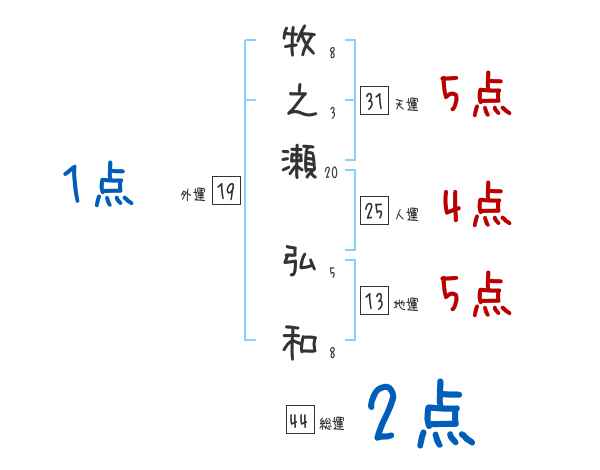 総運![]() | 牧之瀬弘和さんの総運は44画の2つ星!誠実で慎重な性格。物事を考えすぎないように注意しましょう。 あなたの人生を表す1番重要な運勢です。生涯を通じて影響する総合運となり、主に50歳以降の晩年期に影響を及ぼします。 |