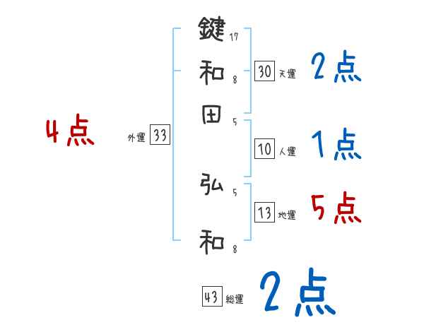 外運![]() | 鍵和田弘和さんの外運は33画の4つ星!権力志向でプライドが高い。勇気があり運を切り開き成功する。 生活面を象徴する運勢です。外部から受ける影響力を表し、結婚運、家庭運や職場、環境への順応性を表します。 |
