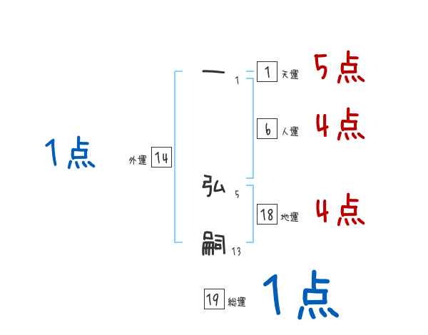 天運![]() | 一弘嗣さんの天運は1画の5つ星!行動力、指導力があり出世し繁栄する。幸運に恵まれる。 家系が持つ宿命的な運勢を表します。祖先から受け継いだ苗字ですので自分の力が及びません。家柄を象徴します。 |