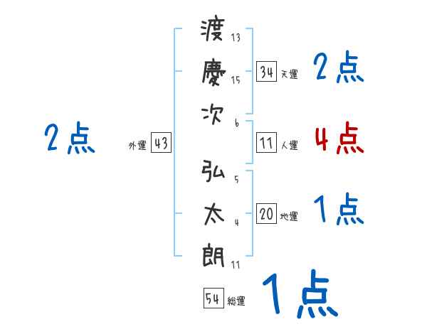 外運![]() | 渡慶次弘太朗さんの外運は43画の2つ星!頑固な性格で独立心が強いかも。やや非現実的で浪費に注意しましょう。 生活面を象徴する運勢です。外部から受ける影響力を表し、結婚運、家庭運や職場、環境への順応性を表します。 |