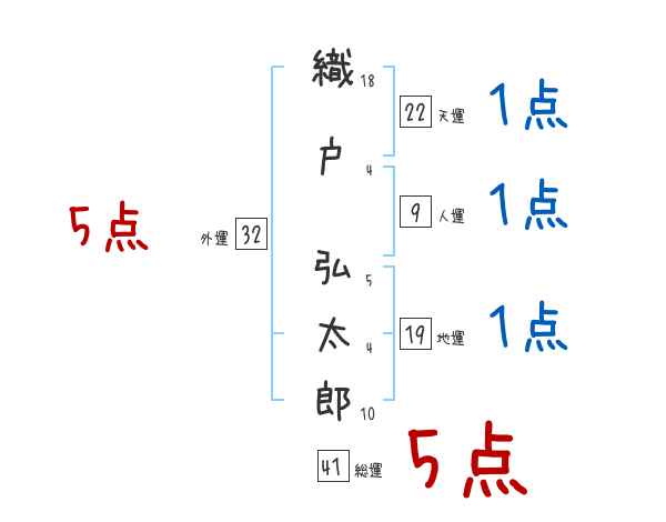 外運![]() | 織戸弘太郎さんの外運は32画の5つ星!柔軟性があり成功する。チャンスが多く金運が良い。 生活面を象徴する運勢です。外部から受ける影響力を表し、結婚運、家庭運や職場、環境への順応性を表します。 |