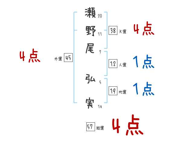 総運![]() | 瀬野尾弘実さんの総運は57画の4つ星!向上心があり人望がある。地位を得る。 あなたの人生を表す1番重要な運勢です。生涯を通じて影響する総合運となり、主に50歳以降の晩年期に影響を及ぼします。 |