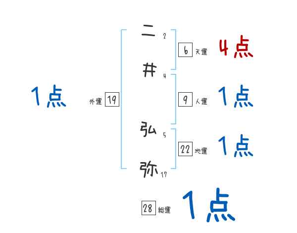 天運![]() | 二井弘弥さんの天運は6画の4つ星!慎重な努力家で信頼を得る。誠実な精神で向上心に優れる。 家系が持つ宿命的な運勢を表します。祖先から受け継いだ苗字ですので自分の力が及びません。家柄を象徴します。 |