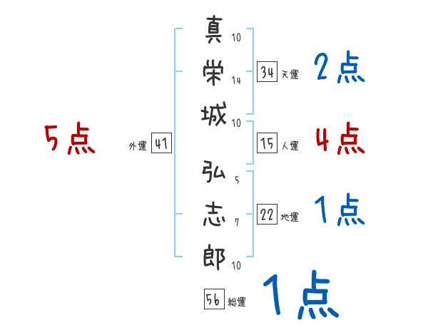 総運![]() | 真栄城弘志郎さんの総運は56画の1つ星!消極的で無気力になりがち。誠実な気持ちが必要でしょう。 あなたの人生を表す1番重要な運勢です。生涯を通じて影響する総合運となり、主に50歳以降の晩年期に影響を及ぼします。 |