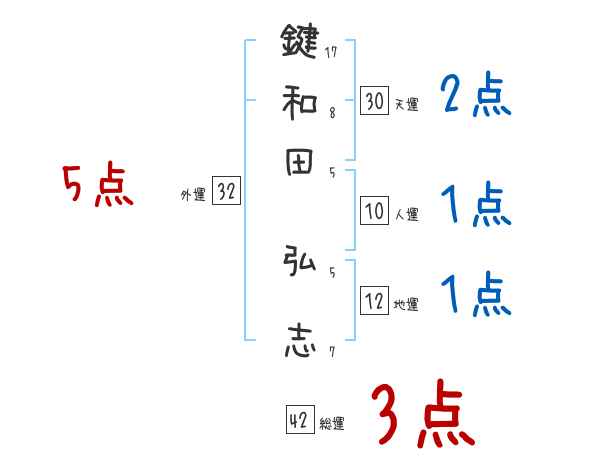 外運![]() | 鍵和田弘志さんの外運は32画の5つ星!柔軟性があり成功する。チャンスが多く金運が良い。 生活面を象徴する運勢です。外部から受ける影響力を表し、結婚運、家庭運や職場、環境への順応性を表します。 |