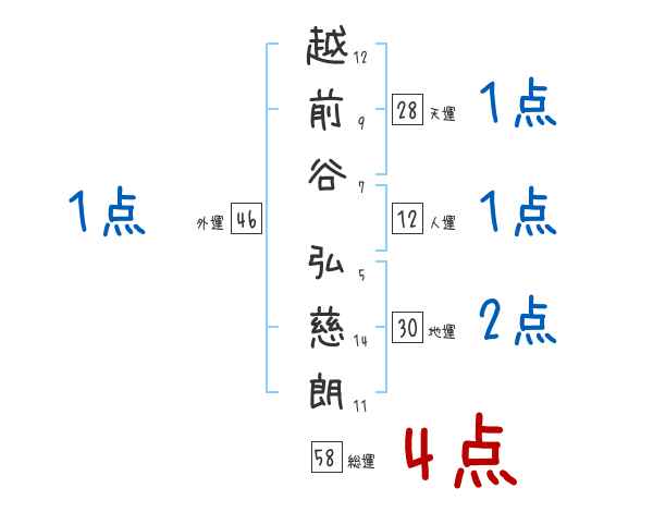 天運![]() | 越前谷弘慈朗さんの天運は28画の1つ星!家庭環境に注意。スポーツで活躍できる能力があるかも。 家系が持つ宿命的な運勢を表します。祖先から受け継いだ苗字ですので自分の力が及びません。家柄を象徴します。 |