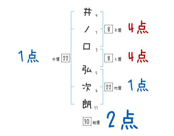 総運![]() | 井ノ口弘次朗さんの総運は30画の2つ星!浮き沈みの激しさに注意しましょう。 あなたの人生を表す1番重要な運勢です。生涯を通じて影響する総合運となり、主に50歳以降の晩年期に影響を及ぼします。 |