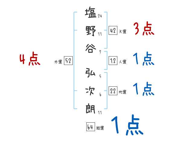 外運![]() | 塩野谷弘次朗さんの外運は52画の4つ星!先見性と独創性に優れ考える力がある。強運の持ち主。 生活面を象徴する運勢です。外部から受ける影響力を表し、結婚運、家庭運や職場、環境への順応性を表します。 |