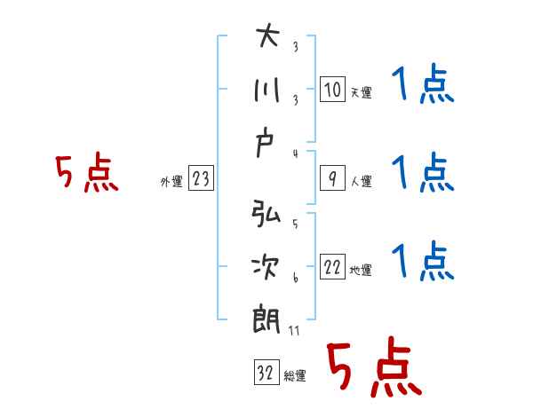 総運![]() | 大川戸弘次朗さんの総運は32画の5つ星!柔軟性があり成功する。チャンスが多く金運が良い。 あなたの人生を表す1番重要な運勢です。生涯を通じて影響する総合運となり、主に50歳以降の晩年期に影響を及ぼします。 |