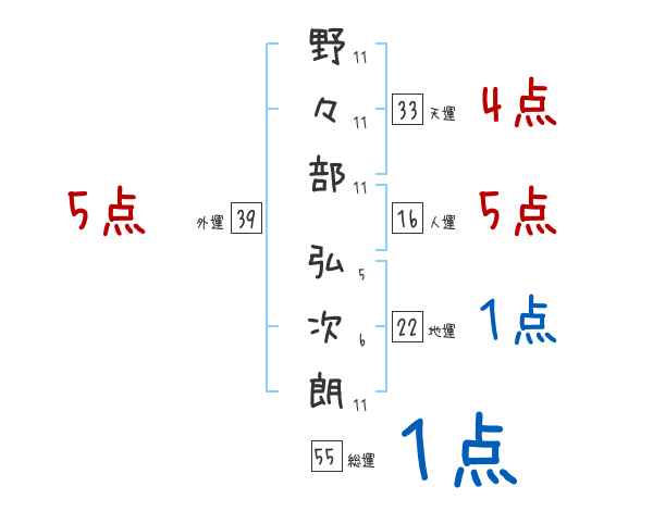人運![]() | 野々部弘次朗さんの人運は16画の5つ星!人望が厚く大きく発展する。逆転成功が見える。 性格や才能などを表す2番目に重要な運勢です。人間関係や協調性、社会的な成功に影響します。主に20歳から50歳ぐらいまでの中年期の運勢を表します。 |