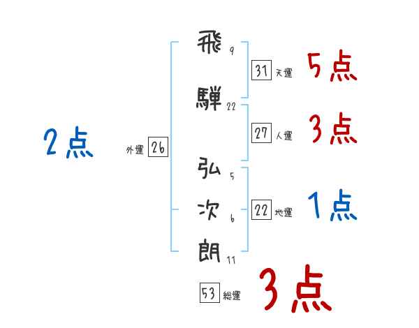 総運![]() | 飛騨弘次朗さんの総運は53画の3つ星!やや見栄っ張りで虚栄心がある。散財に注意。 あなたの人生を表す1番重要な運勢です。生涯を通じて影響する総合運となり、主に50歳以降の晩年期に影響を及ぼします。 |