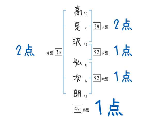 外運![]() | 高見沢弘次朗さんの外運は34画の2つ星!独創性に優れるが、自尊心が強く災難に注意しましょう。 生活面を象徴する運勢です。外部から受ける影響力を表し、結婚運、家庭運や職場、環境への順応性を表します。 |