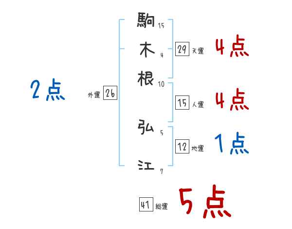 天運![]() | 駒木根弘江さんの天運は29画の4つ星!完全主義で才能がある。厳格な心の持ち主。 家系が持つ宿命的な運勢を表します。祖先から受け継いだ苗字ですので自分の力が及びません。家柄を象徴します。 |