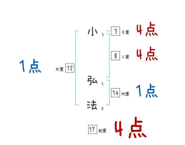 天運![]() | 小弘法さんの天運は3画の4つ星!活動的で才能に恵まれ、多くの信頼を得る。希望に満ち成長する。 家系が持つ宿命的な運勢を表します。祖先から受け継いだ苗字ですので自分の力が及びません。家柄を象徴します。 |