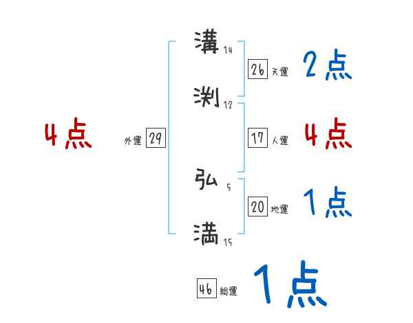 総運![]() | 溝渕弘満さんの総運は46画の1つ星!迷走することが多く苦労するかも。目先のことにとらわれないように。 あなたの人生を表す1番重要な運勢です。生涯を通じて影響する総合運となり、主に50歳以降の晩年期に影響を及ぼします。 |