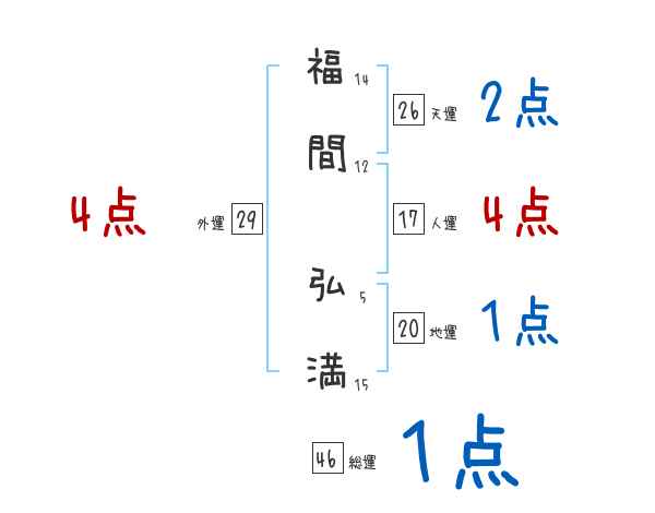 天運![]() | 福間弘満さんの天運は26画の2つ星!波瀾万丈かも。信頼できる人を大事にしましょう。 家系が持つ宿命的な運勢を表します。祖先から受け継いだ苗字ですので自分の力が及びません。家柄を象徴します。 |