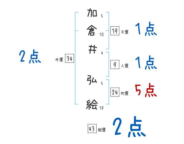 総運![]() | 加倉井弘絵さんの総運は43画の2つ星!頑固な性格で独立心が強いかも。やや非現実的で浪費に注意しましょう。 あなたの人生を表す1番重要な運勢です。生涯を通じて影響する総合運となり、主に50歳以降の晩年期に影響を及ぼします。 |
