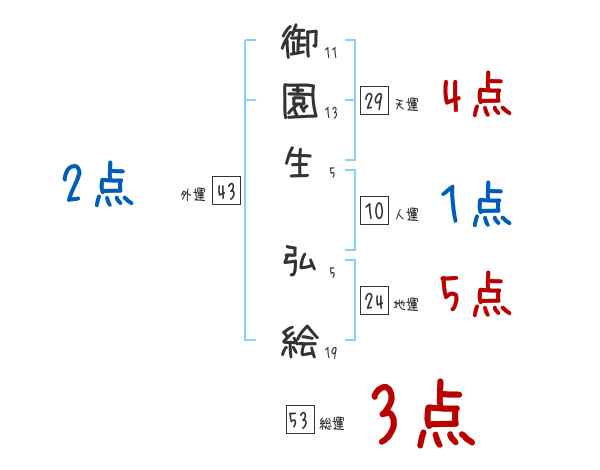 総運![]() | 御園生弘絵さんの総運は53画の3つ星!やや見栄っ張りで虚栄心がある。散財に注意。 あなたの人生を表す1番重要な運勢です。生涯を通じて影響する総合運となり、主に50歳以降の晩年期に影響を及ぼします。 |