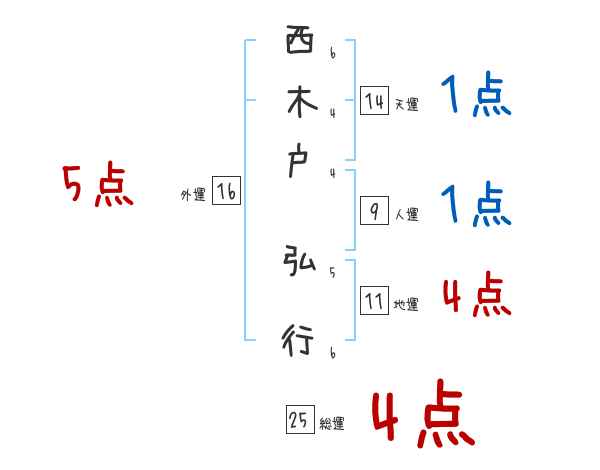天運![]() | 西木戸弘行さんの天運は14画の1つ星!人に対して優しいがストレスを溜め込みがち。人間関係のトラブルを避けるよう気をつけましょう。 家系が持つ宿命的な運勢を表します。祖先から受け継いだ苗字ですので自分の力が及びません。家柄を象徴します。 |