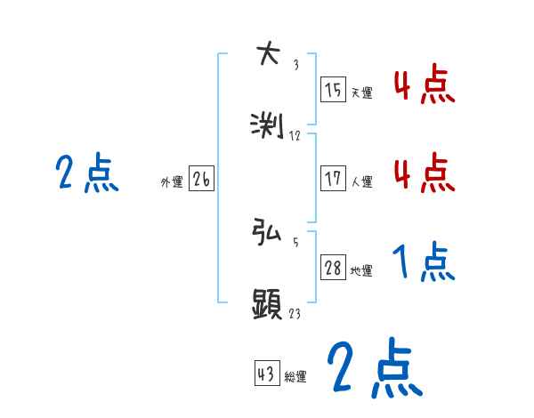 総運![]() | 大渕弘顕さんの総運は43画の2つ星!頑固な性格で独立心が強いかも。やや非現実的で浪費に注意しましょう。 あなたの人生を表す1番重要な運勢です。生涯を通じて影響する総合運となり、主に50歳以降の晩年期に影響を及ぼします。 |