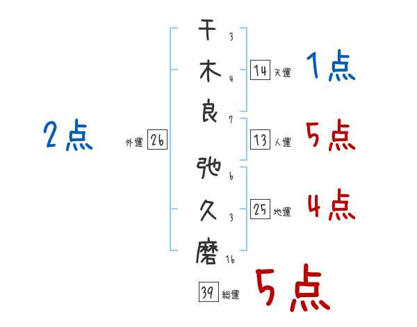 人運![]() | 千木良弛久磨さんの人運は13画の5つ星!才能に恵まれ人気がある。名声を手に入れる。円満な人生。 性格や才能などを表す2番目に重要な運勢です。人間関係や協調性、社会的な成功に影響します。主に20歳から50歳ぐらいまでの中年期の運勢を表します。 |