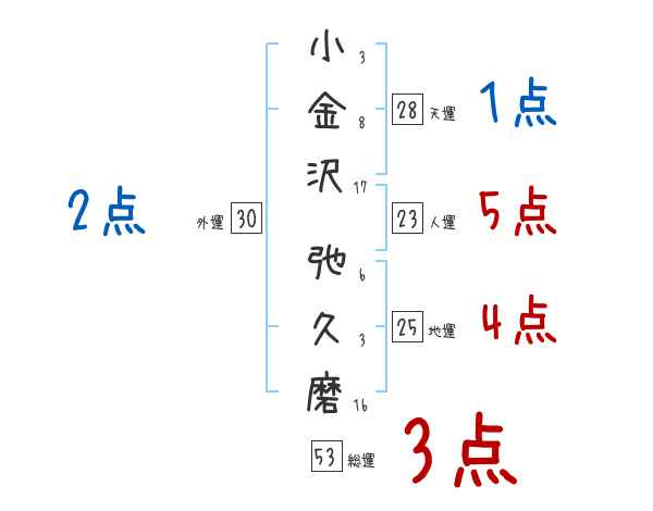 総運![]() | 小金沢弛久磨さんの総運は53画の3つ星!やや見栄っ張りで虚栄心がある。散財に注意。 あなたの人生を表す1番重要な運勢です。生涯を通じて影響する総合運となり、主に50歳以降の晩年期に影響を及ぼします。 |