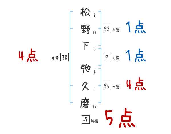 外運![]() | 松野下弛久磨さんの外運は38画の4つ星!温厚な性格で技術的な才能を発揮する。職人的な仕事に向いている。 生活面を象徴する運勢です。外部から受ける影響力を表し、結婚運、家庭運や職場、環境への順応性を表します。 |