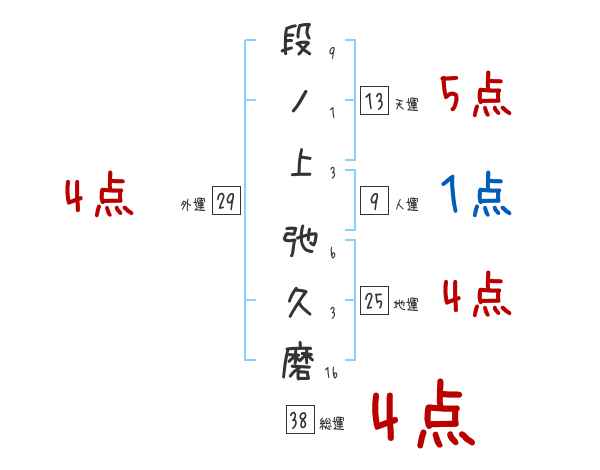 人運![]() | 段ノ上弛久磨さんの人運は9画の1つ星!消極的で才能を発揮することが苦手なことも。周りの意見に耳を傾けましょう。 性格や才能などを表す2番目に重要な運勢です。人間関係や協調性、社会的な成功に影響します。主に20歳から50歳ぐらいまでの中年期の運勢を表します。 |