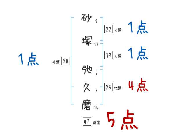 天運![]() | 砂塚弛久磨さんの天運は22画の1つ星!努力することが苦手ないっぽう手先が器用。芸術性にも優れる。 家系が持つ宿命的な運勢を表します。祖先から受け継いだ苗字ですので自分の力が及びません。家柄を象徴します。 |