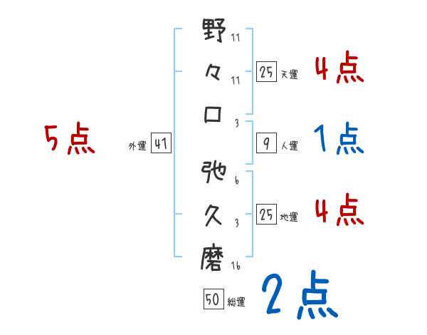 天運![]() | 野々口弛久磨さんの天運は25画の4つ星!個性があり才能があふれる。強運の持ち主で発展する。 家系が持つ宿命的な運勢を表します。祖先から受け継いだ苗字ですので自分の力が及びません。家柄を象徴します。 |