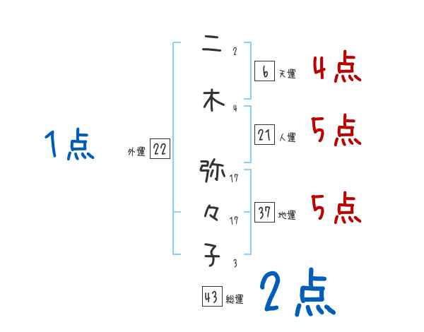人運![]() | 二木弥々子さんの人運は21画の5つ星!統率力がある。独立し成功する。名誉を手に入れる。 性格や才能などを表す2番目に重要な運勢です。人間関係や協調性、社会的な成功に影響します。主に20歳から50歳ぐらいまでの中年期の運勢を表します。 |