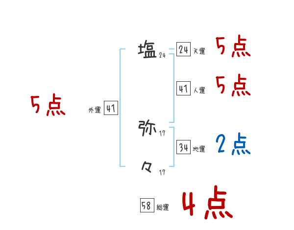 外運![]() | 塩弥々さんの外運は41画の5つ星!大志を抱き、目標に向かって実力を発揮し達成する。温和な性格。 生活面を象徴する運勢です。外部から受ける影響力を表し、結婚運、家庭運や職場、環境への順応性を表します。 |