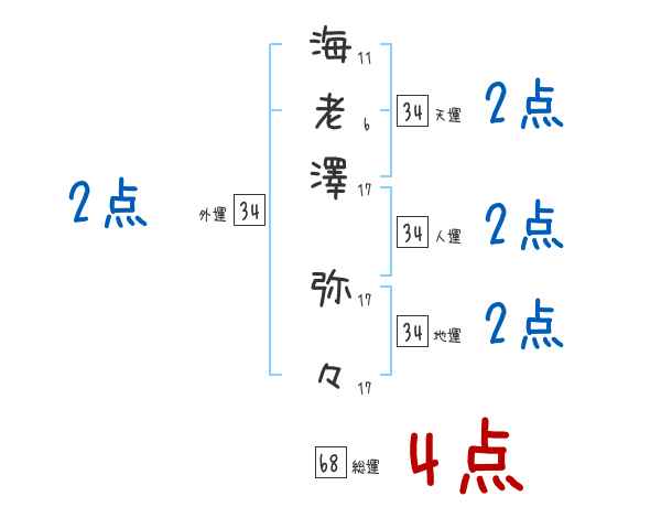 外運![]() | 海老澤弥々さんの外運は34画の2つ星!独創性に優れるが、自尊心が強く災難に注意しましょう。 生活面を象徴する運勢です。外部から受ける影響力を表し、結婚運、家庭運や職場、環境への順応性を表します。 |